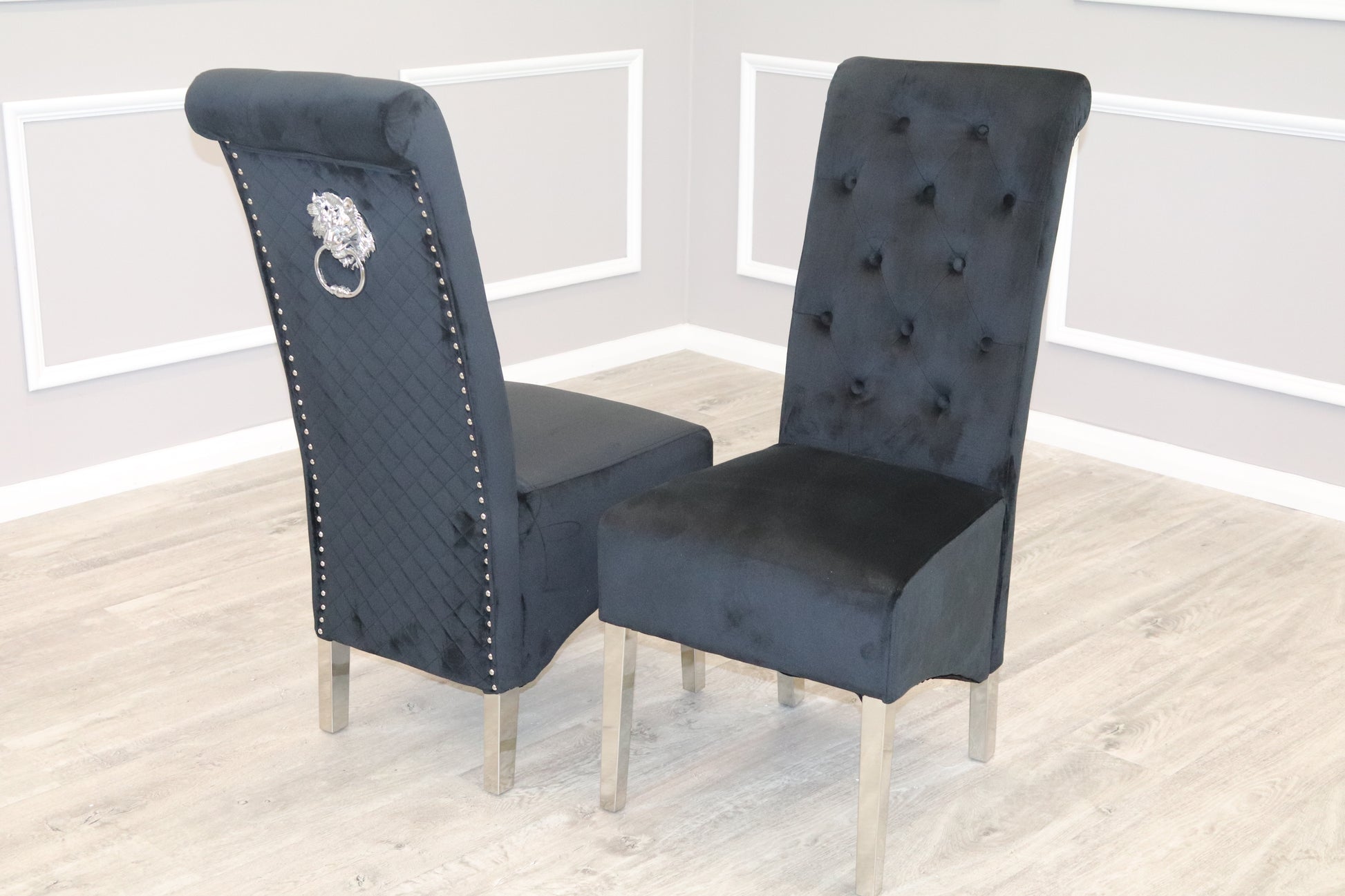 Elevate your dining experience with the Emma Dining Chair, the epitome of class and sophistication. Upholstered in luxurious soft velvet, this chair boasts a stunning tall scroll top adorned with buttoned detailing for an elegant touch. The striking chrome lion knocker enhances the quilted stitched back, making it a true statement piece. Perfect for adding a refined charm to any dining space, the Emma Dining Chair beautifully combines comfort and style, ensuring your dining area is both inviting and stylish.
